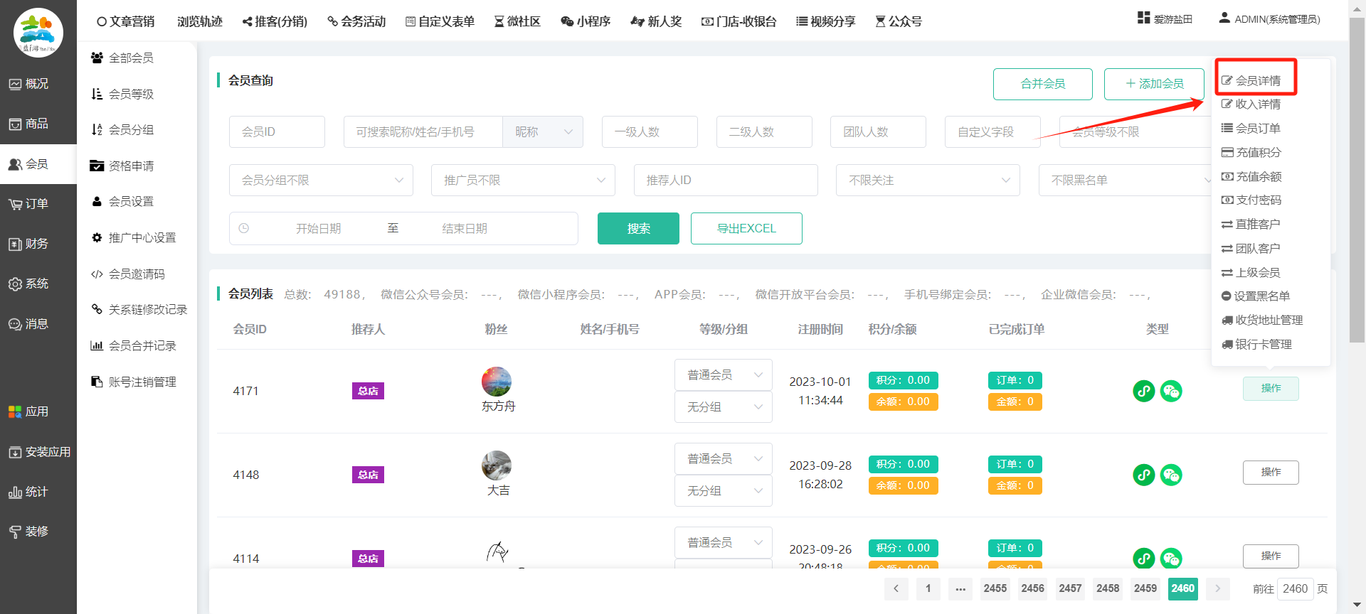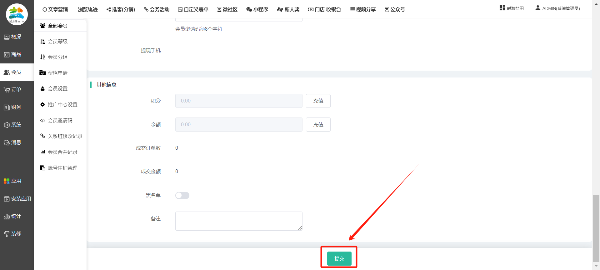 目录 搜索 展开 一、前期准备资料二、数字乡村码-上线操作指南1、服务号的申请流程及认证2、申请小程序流程3、开放平台绑定小程序和公众号三、数字乡村码-系统操作数字乡村码系统管理-概况数字乡村码-商品管理1、发布商品2、商品列表3、商品表单4、商品分类5、品牌管理6、配送模板7、评论管理8、优惠券管理9、商品标签10、退货地址设置11、满额优惠12、批量操作13、配送方式14、基础设置15、商品隐藏四、数字乡村码-会员管理1、全部会员2、会员等级3、会员分组4、资格申请5、会员设置6、推广中心设置7、会员邀请码8、会员关系链修改关系链修改记录9、会员合并记录10、账号注销管理11、会员设置中心五、数字乡村码-订单管理1、订单管理列表2、订单处理流程3、订单状态4、订单修改价格5、订单退款退货6、多包裹发货7、批量发货订单操作步骤8、催发货订单9、物流查询六、数字乡村码-财务管理1、余额设置2、会员余额3、充值记录4、转让记录5、余额明细6、收入明细7、提现设置8、提现统计9、积分管理10、转账审核11、收益广告12、批量充值七、数字乡村码-系统管理1、商城入口2、商城设置①、商城设置②、订单设置③、物流查询④、短信⑤、联系方式⑥、分类⑦、优惠券⑧、分享⑨、幻灯片⑩、广告位⑫、地图设置3、交易设置4、微信模板消息自定义消息模板(新版)自定义消息模板(旧版)小程序消息模板公众号模板消息变更公告5、语言设置6、权限管理7、多媒体管理八、数字乡村码-消息管理九、数字乡村码-应用管理十、数字乡村码系统-数据统计十一、数字乡村码-页面装修DIY1、模板管理2、店铺页面3、顶部导航4、底部导航5、DIY模板市场6、首屏广告7、基础设置8、装修DIY尺寸建议十二、供应商功能插件操作指南1、供应商2、门店-收银台门店申请和使用步骤门店管理①、门店-收银台 营销设置②、门店-收银台 分润设置门店分类门店申请门店审核门店商品门店商品订单收银台订单数据统计核销员基础设置默认设置门店装修3、微社区4、会务活动十三、营销插件操作指南活动报名提货卡新人奖微店问卷调查积分视频分享1、视频分享基础设置2、视频分享发现管理3、视频分享分类管理4、视频分享评论管理5、视频分享分红记录6、视频分享短视频中心每日红包幸运大抽奖签到优惠券二维码任务奖励优惠劵文章音频文章付费文章限时购新海报拓客卡操作流程积分活动素材中心视频红包十四、入驻门店应用类1、门店预约2、附近商品3、门店定位设置4、门店控制5、门店满额包邮6、门店满额减7、导入商品8、门店搜索9、门店股东10、核销券11、多门店核销1、商城后台设置2、前端功能演示十五、常见问题1、后台登录密码修改流程2、会员-余额,积分,后台如何进行充值与扣除3、如何修改上下级关系4、一种万能的获取商城小程序路径的方法 暂无相关搜索结果! 阅读次数:1406 本文档使用 模王系统 发布 8、会员关系链修改 8、会员关系链修改一.如何修改上下级关系?1.会员-全部会员-可以通过搜索用户的独立ID,或者用户微信昵称,找到此会员,然后点击右边的(操作)2.再点击会员详情。3.滑到下面,有个推广信息-会员上线,点击修改4.输入上级的ID号,点击搜索,出来此上级会员后点击选择。5.滑到最下面,一定要点击提交按钮。文档更新时间: 2023-11-30 14:56 作者:链上旅行