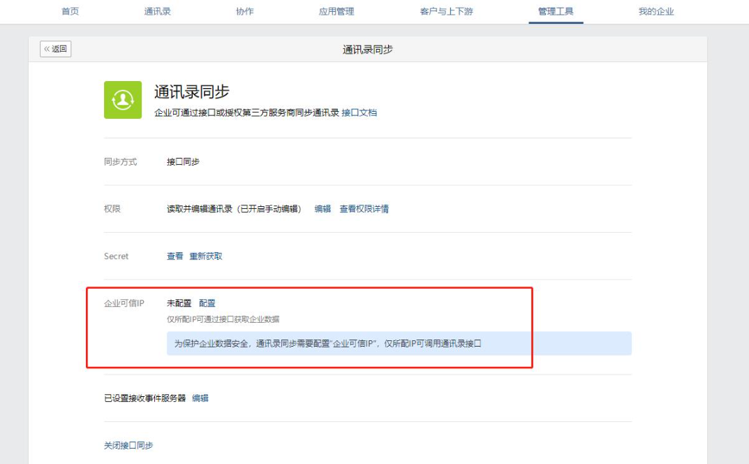 处理方法:企业微信官方后台 -- 管理工具 -- 通讯录同步 -- 企业可信ip 添加下自己站点服务器ip.