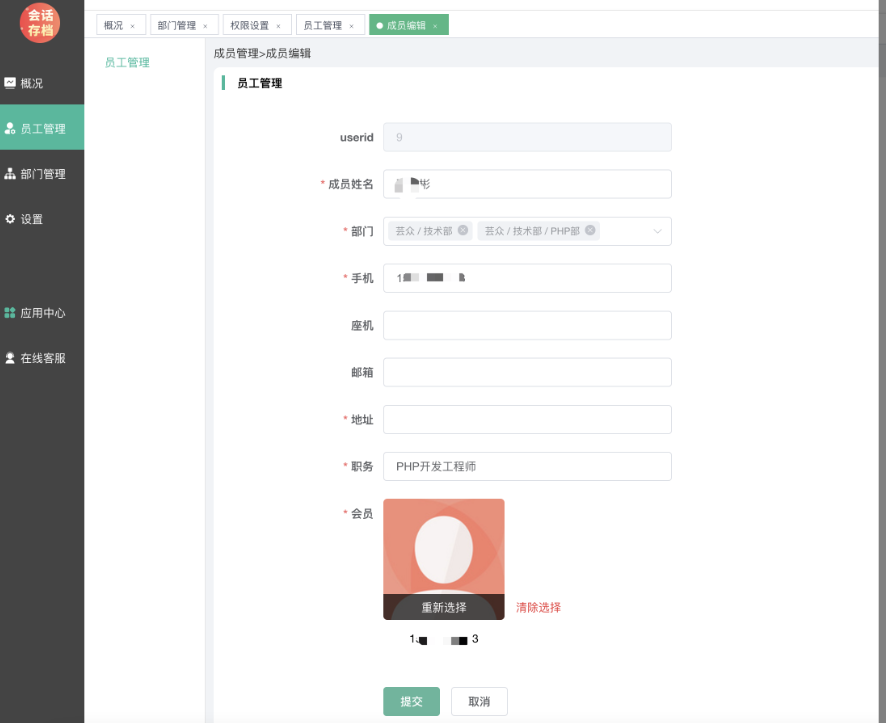 操作--编辑,可查看员工详细信息,并可手动关联系统会员